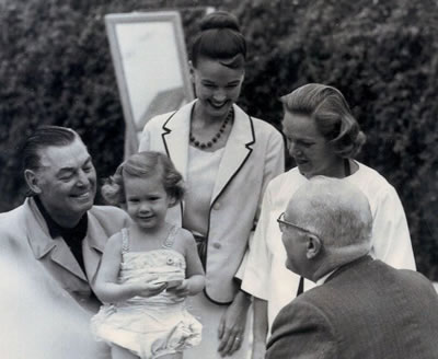 Virginia says both children were good students but Mary Frances was more outgoing and the 'perfect student'. At age 2 years she could back float, jump in and swim 25 feet recovering up to the surface to get air as she went. Virginia covered all the skills with the 2-year old that were then associated with the American Red Cross 'Beginner' test. Regarding the amount of instruction given Virginia states: "Mary Frances started swimming at age 10 months and she was almost 2 1/2 years old in February 1962. We swam 3 times a week for 1/2 hour excluding vacations. I don't recall either she or Harry staying home because of illness. So it took about 175 to 180 hours of time in the water including play time for Mary Frances to learn the skills she needed to pass the Red Cross beginner's test. Virginia contacted the Los Angeles area office of the Red Cross to secure a 'beginner' card for her student. Given Mary Frances's achievements for her age and her famous father, local Red Cross Director Roger Plaisted agreed to present the card himself at poolside at the Moss residence in February of 1962 - hence the photo! National magazines, newspapers and TV were present for the ceremony. Famous swimmer and actor Johnny Weismuller came along with Plaisted. Kathryn Crosby accompanied her daughter but Bing did not attend.