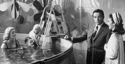 Mary Frances demonstrated her swimming prior to receiving her card. Virginia recalls: "I didn't want to take her to a new and strange place for the demonstration even though she was quite outgoing so we held the ceremony at the Moss's home where the lessons had been all along. I didn't want to take any chances knowing the entire media would be there. I also didn't change my swim suit from the one I wore in the lessons and I asked her mother not to let Mary Frances wear a different one either. I treated it as though it were another lesson. Heavy, heavy hung over my head. And luckily it was very successful." Virginia was also commissioned to teach children of actor John Wayne. Virginia said that she can vouch for John Wayne being a terrific person. When Virginia asked if Wayne could attend an award ceremony for his children's swimming, an aid to Wayne interjected that his schedule would not permit it. Wayne over road the appointment saying, "Oh that can wait till Saturday, we can do this for Ginny." ('Ginny' rather than Virginia as she was and is know by friends from the past.) Virginia also taught a daughter of author Harold Robbins - Adriana When they met Virginia a the door of their home on the first lesson day, Adriana said "I am not going to put my face in" to which Virginia responded "Well you don't have to do anything that you don't want to do." In working with Adriana, Virginia put her own face in and glance around the pool, came up and remarked to Adriana, "Do you know you have gold fish in your pool?" "No we don't" said Adriana over and over again. But shortly there after, Adrian put her face in and rose to remark, "We also have an octopus in our pool!" Admitting that she didn't know who Harold Robbins was, Virginia laughs when she recalls a conversation with Robbins' wife. "We talked about my book (published in 1967) and she said, 'You know, my husband is a writer too'. I said "Oh really what does he write?". "Novels", his wife said. Virginia also taught the daughter of Sonny & Cher - Chastity. According to Virginia there was little to teach Chastity since father - Sonny - had already done a good job of it. Virginia has been featured in the New York Times and interviewed by Barbara Walters on the NBC Today Show. She'd also made a trip to Philadelphia with Katherine Crosby to appear on the Mike Douglas TV Show. Picture A Rabbit Does The Trick According to Virginia there was a chance meeting that would greatly shape her teaching style as recorded in her 1967 for the future. Here husband was a producer and was filming a commercial for a bank wherein a rabbit had been trained to pick up a silver dollar and place it into a small bank. Virginia was on the set when the commercial was being filmed and spoke with the person who'd trained the rabbit - a Dr. Shaw from the Univ. of Arkansas. He said that in training the rabbit every time the animal would go near the bank, a bell would ring he'd be given food - positive reinforcement. That rabbit changed the face of infant swimming as Virginia went on to make applications to her teaching. She thought she'd try that with a friend's baby and was granted permission. She knew also that babies like to please their parents. Every time child did what Virginia wanted, she'd give praise. Any action or response that was not desired would be largely ignored. In addition Virginia read about the work of scientists Pavlov and BF Skinner on positive reinforcement. Later she gave students poker chips as reinforcement - the chips were kid-size, brightly colored and water proof. As a Side note - for her 80th birthday Virginia was given actual red, white, and blue poker chips with her contact information imprinted - serving as 'business cards'. The reinforcement of desired actions was used instead simply forcing the young students says Virginia.